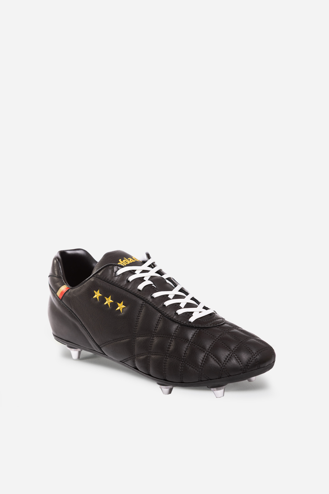 On the side, the three gold stars stand out as a true symbol of Pantofola d’Oro heritage, while the gold-and-red flag running from the collar to the heel pays tribute to Spain, adding a refined and recognizable color accent. Every detail of the “Del Duca” is designed to combine elegance and functionality, just like the great football boots of the past.