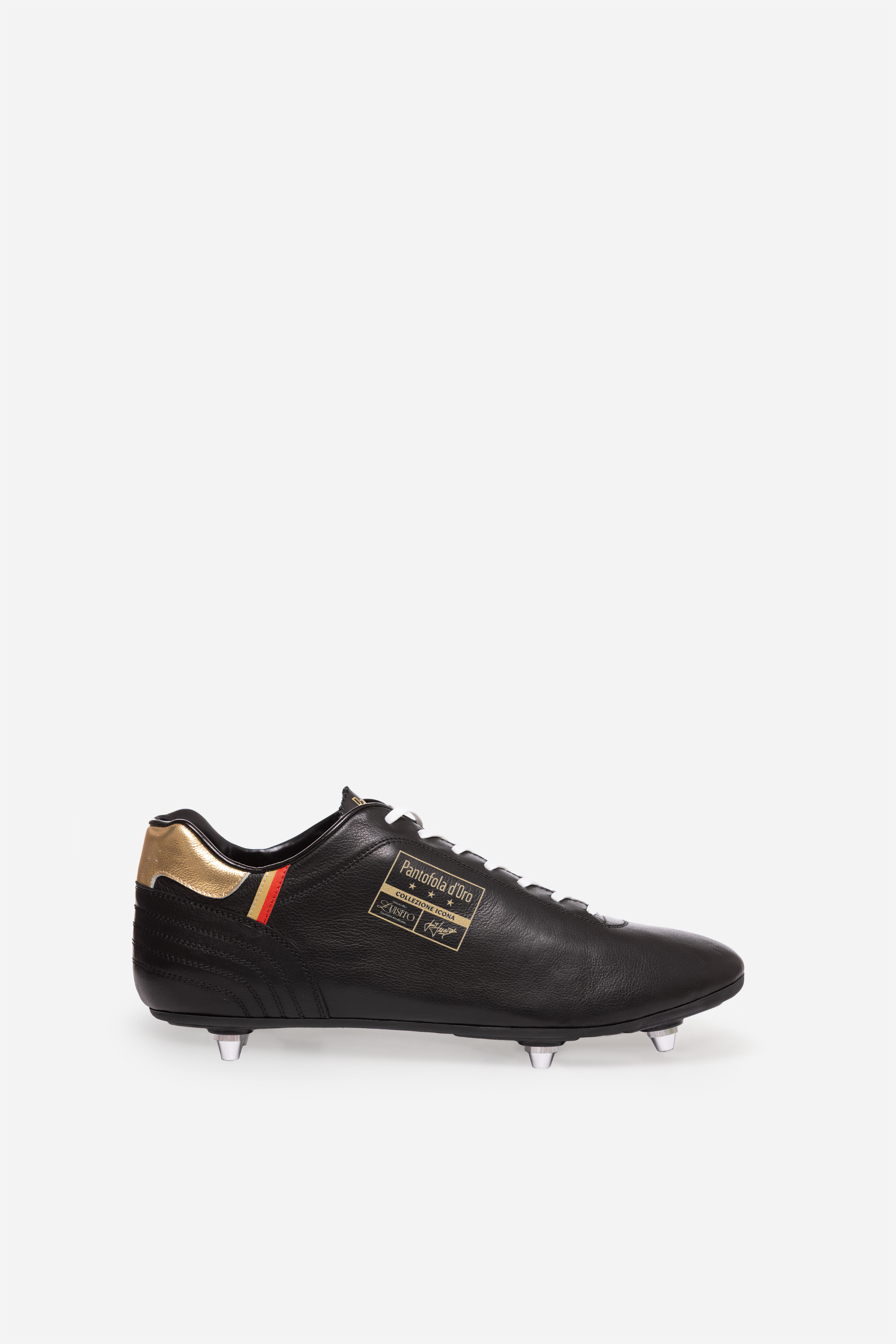 This version is enhanced by a clearly visible lateral silk-screen print, recalling inscriptions and iconic logos. The rear heel tab uses gold laminated leather, matching the lateral print, while parallel stitching runs along the heel, characteristic of football shoes from the last century. The tongue is enriched with the Pantofola d’Oro logo in gold silk-screen print, and the gold-and-red flag running from the collar to the heel adds a distinctive detail that completes the classic Lazzarini style.