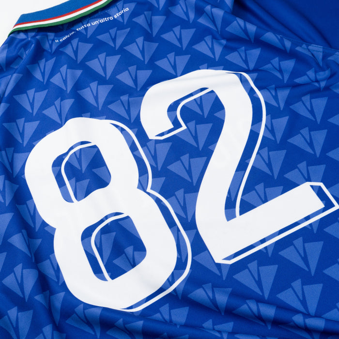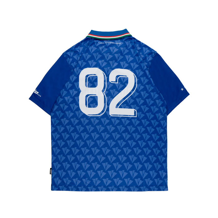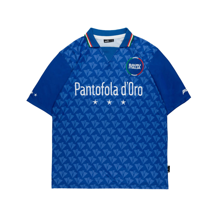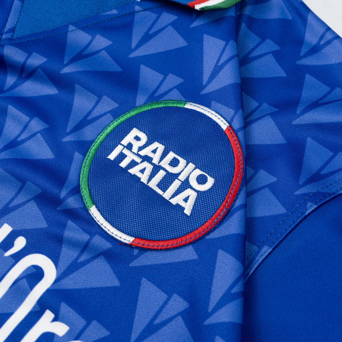 La maglia celebrativa è ispirata alle divise da calcio degli anni ’90, con un pattern geometrico rétro, dettagli tricolore sul colletto e i loghi dei due brand sul petto. Un capo pensato per raccontare, attraverso lo stile, l’energia degli eventi live e la cultura sportiva e musicale italiana.